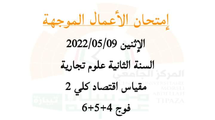 إمتحان أعمال موجهة للأستاذ زايخ محمد أمين يوم الإثنين 09/05/2022السنة الثانية علوم تجارية مقياس اقتصاد كلي 2فوج 4+5+6 من 12.00-13.00 بقاعة المحاضرات 3 مبنى 2000