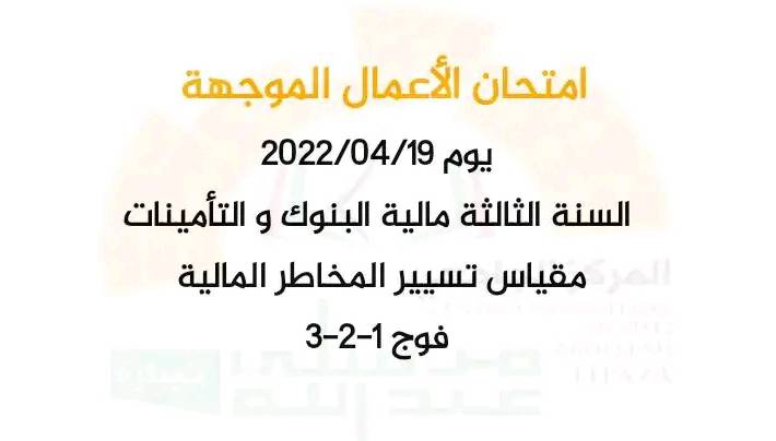 إمتحان الأعمال الموجهة للأستاذ فيجل عبد الحميد ليوم الثلاثاء 2022/04/19السنة الثالثة مالية البنوك و التأمينات مقياس تسيير المخاطر المالية فوج من 1+2+3 من 14.30-15.30 بمدرج أ مبنى 2000