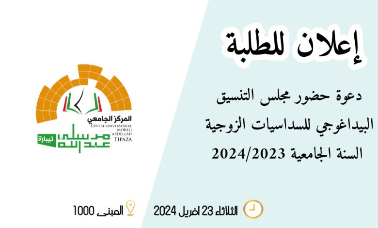 في إطار متابعة السير الحسن لعملية التدريس على مستوى معهد العلوم الاقتصادية التجارية وعلوم التسيير، ندعوا الطلبة ممثلي الأفواج ونوابهم لحضور اجتماع المجلس التنسيقي البيداغوجي الثاني للسداسيات الزوجية للسنة الجامعية 2023/2024   وذلك