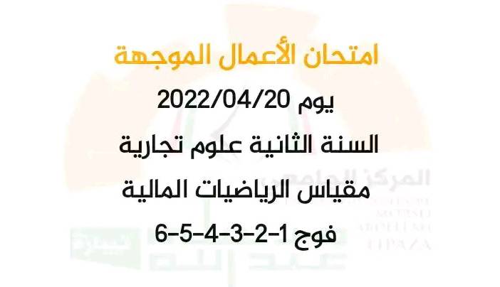 امتحان أعمال موجهة للأستاذ بوجلال ناصر ليوم الأربعاء 2022/04/20السنة الثانية علوم تجارية مقياس الرياضيات المالية