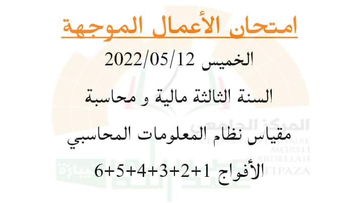 إمتحان أعمال موجهة للأستاذة خالف كاتبة ليوم الخميس 12/05/2022السنة الثالثة مالية و محاسبة مقياس نظام المعلومات المحاسبي
