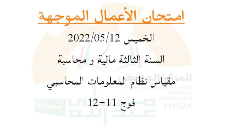 إمتحان أعمال موجهة للأستاذ شيكر أيوب ليوم الخميس 12/05/2022السنة الثالثة مالية و محاسبة مقياس نظام المعلومات المحاسبي فوج 11 + 12 من 13.00-13.30 بقاعة المحاضرات 3 مبنى 2000