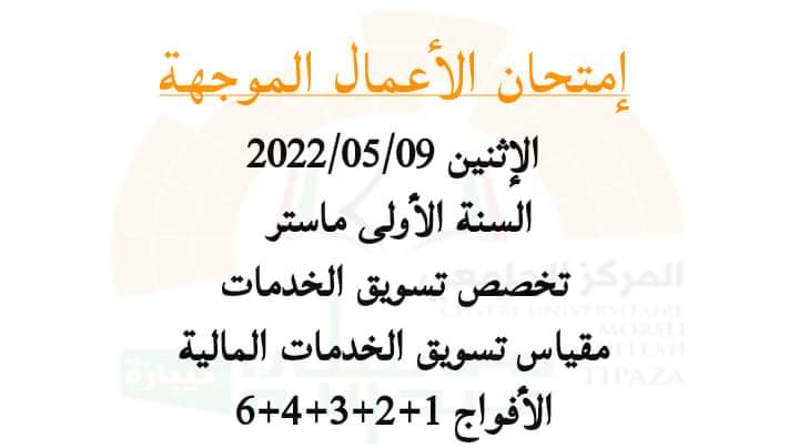 إمتحان أعمال موجهة للأستاذة حشلاف حياة ليوم الإثنين 09/05/2022السنة الأولى ماستر تخصص تسويق الخدمات مقياس تسويق الخدمات المالية