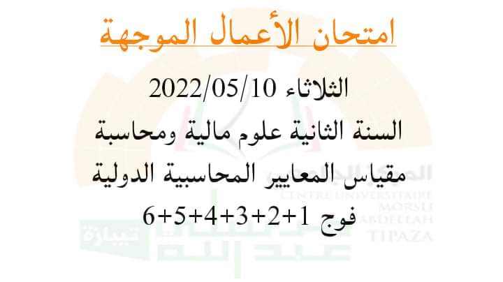 إمتحان أعمال موجهة للأستاذة بولحبال أميرة ليوم الثلاثاء 10/05/2022السنة الثانية علوم مالية ومحاسبة مقياس المعايير المحاسبية الدولية