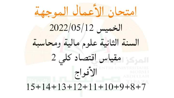 إمتحان أعمال موجهة للأستاذ لكحل عز الدين ليوم الخميس 12/05/2022السنة الثانية علوم مالية ومحاسبة مقياس اقتصاد كلي 2