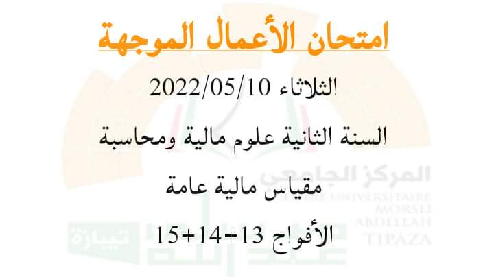امتحان أعمال موجهة للأساتذة بن دهيب ليلى ليوم الثلاثاء 10/05/2022السنة الثانية علوم مالية ومحاسبة مقياس مالية عامة فوج 13+14+15 من 11.00-12.00 بمدرج أ مبنى 2000