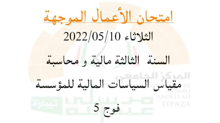امتحان اعمال موجهة للأستاذة رحماني جهاد السنة الثالثة مالية و محاسبة مقياس السياسات المالية للمؤسسة يوم الثلاثاء 2022/05/10