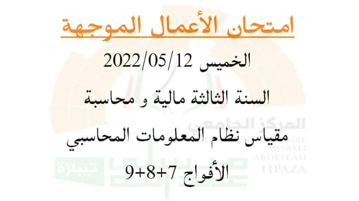 إمتحان أعمال موجهة للأستاذ العثماني مصطفى ليوم الخميس 12/05/2022السنة الثالثة مالية و محاسبة مقياس نظام المعلومات المحاسبي فوج 7+8+9 من 13.00-13.30 بمدرج أ مبنى 2000