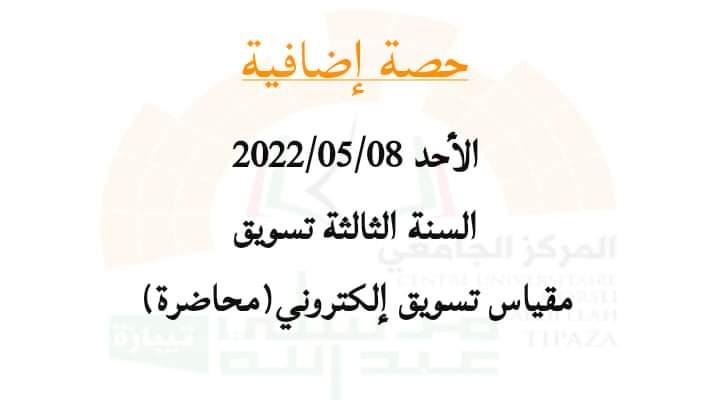 حصة إضافية – محاضرة – للأستاذة حشلاف حياة يوم الأحد 08/05/2022 من 11.00-13.00 بمدرج أ مبنى 1000السنة الثالثة تسويق مقياس تسويق إلكتروني