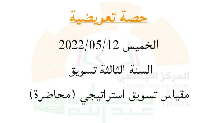 حصة تعويضية – محاضرة – للأستاذ عرابة رابح ليوم الخميس 12/05/2022 من 10.00-11.00 بقاعة المحاضرات 01 مبنى 2000السنة الثالثة تسويق مقياس تسويق استراتيجي