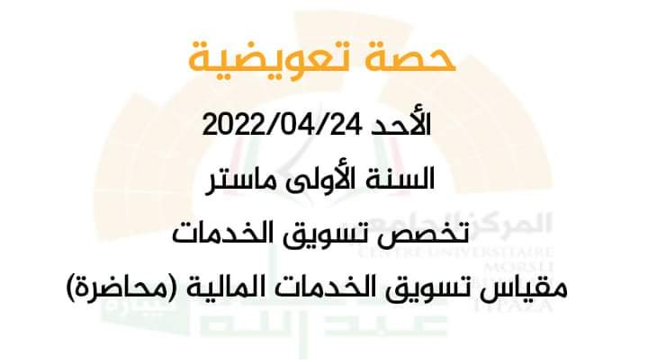 حصة تعويضية ( محاضرة) للأستاذة أودية كهينة ليوم الأحد 24/04/2020 من 12.30-13.30 بقاعة المحاضرات 3 مبنى2000 السنة الأولى ماستر تخصص تسويق الخدمات مقياس تسويق الخدمات المالية