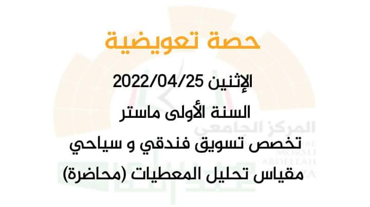 حصة تعويضية ( محاضرة) للأستاذ قسوم عبد القادر ليوم الإثنين 25/04/2022 من 13.30-14.30 مدرج “ج” مبنى 1000 السنة الأولى ماستر تخصص تسويق فندقي و سياحي مقياس تحليل المعطيات