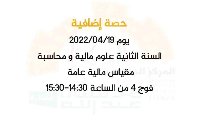 أكمل القراءة »حصة إضافية للأستاذ بونحاس عادل ليوم الثلاثاء 19/04/2022السنة الثانية علوم مالية ومحاسبة مقياس مالية عامة فوج 4 من 14.30-15.30 قاعة 11 مبنى…
