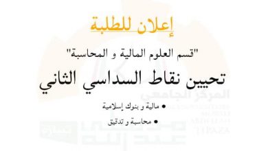 ننهي إلي علم طلبة السنة الاولى والثانية ماستر تخصص محاسبة وتدقيق ومالية وبنوك اسلامية انه سيتم تحيين النقاط الخاصة بالسداسي…