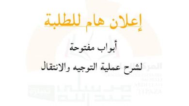 ننهي الى علم الطلبة جميع الشعب والتخصصات والمستويات أنه ستقام أبواب مفتوحة لشرح عملية التوجيه والانتقال للطلبة والأجوبة على كل…
